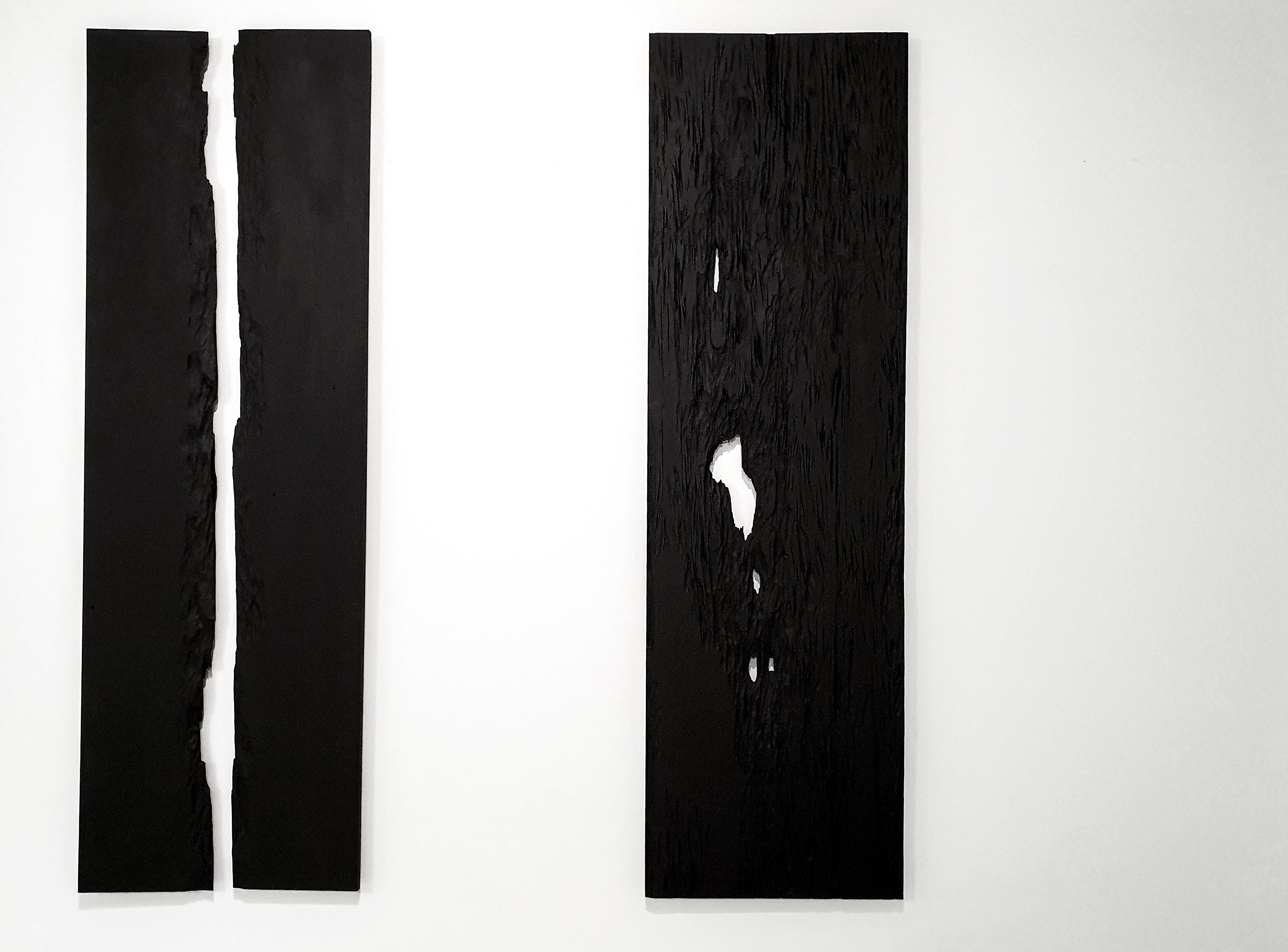 Erottamattomat (Inseparables) 2019 (two elements) / 200 cm x 30 cm x 1,8 cm / woodcarving, painting / pinewood, acrylic paint / Rajallisuus (Finiteness) 2019 / 200 cm x 60 cm x 1,8 cm / woodcarving, painting / pinewood, acrylic paint /