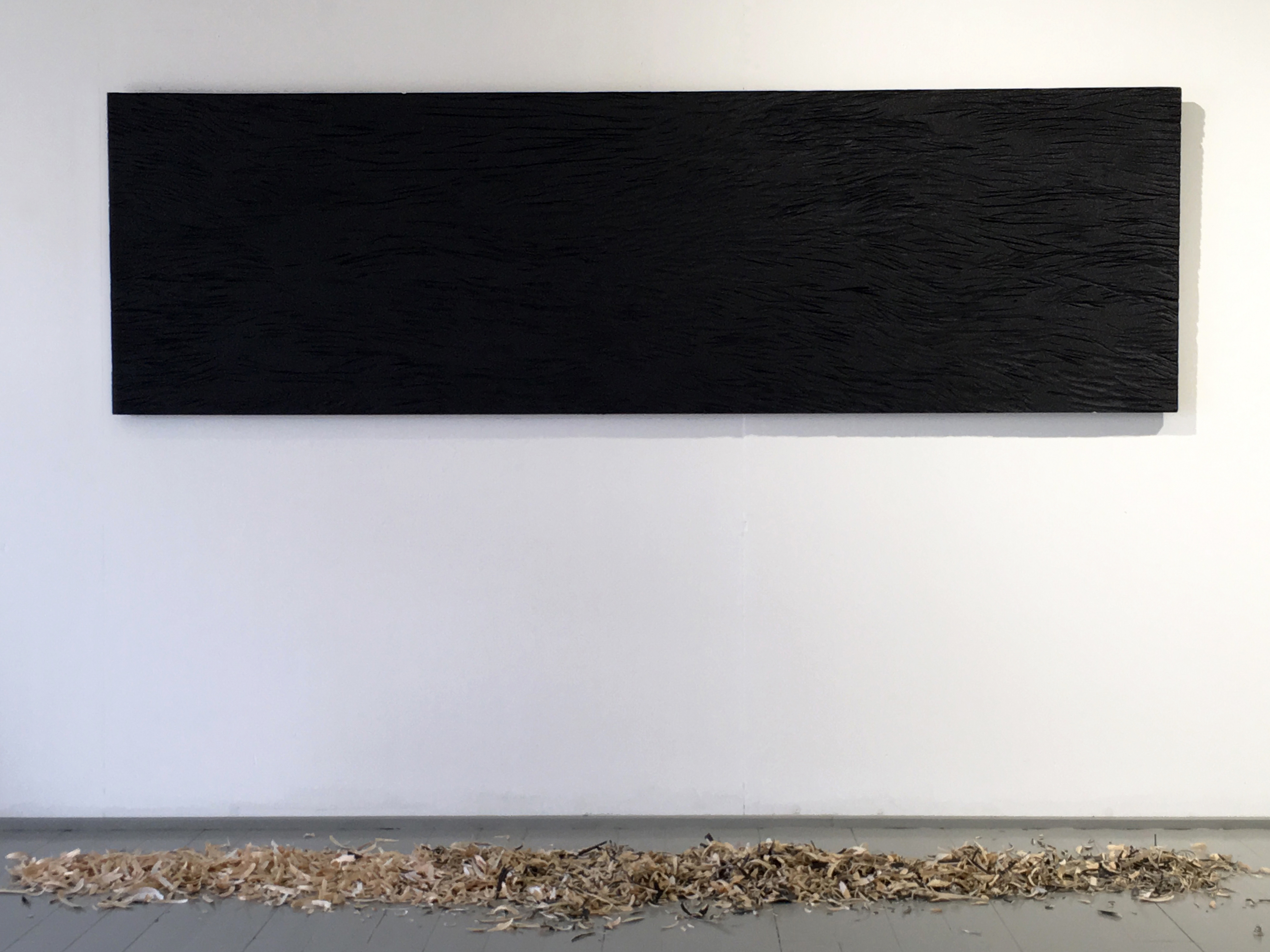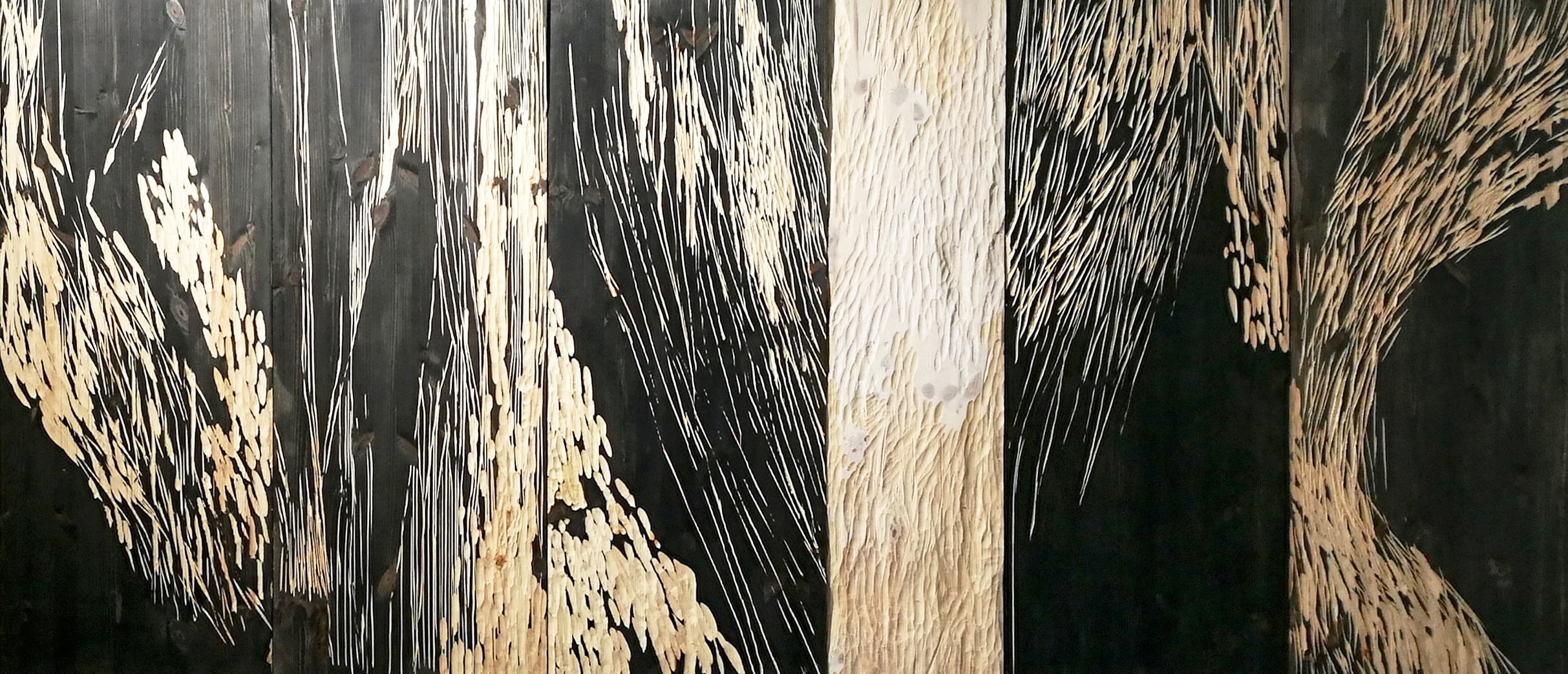 Jäljet (Traces) 2019 / 320 cm x 100 cm x 2 cm / woodcarving, painting / pinewood, pigment / Intersections 2017 / 3 x 60 cm x 120 cm x 2,5 cm / woodcarving, painting / pinewood, rope, acrylic paint /